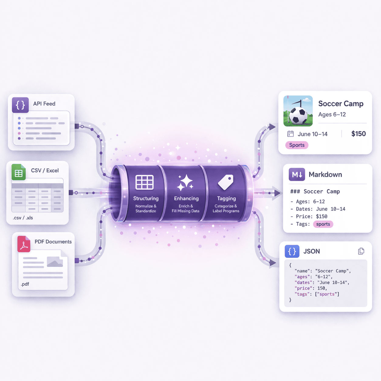 We make planning and attending kids activities easy by organizing the fragmented world of care and enrichment programs into AI-ready inventory that enables AI apps, marketplaces, and platforms to power real-time discovery and enrollment.